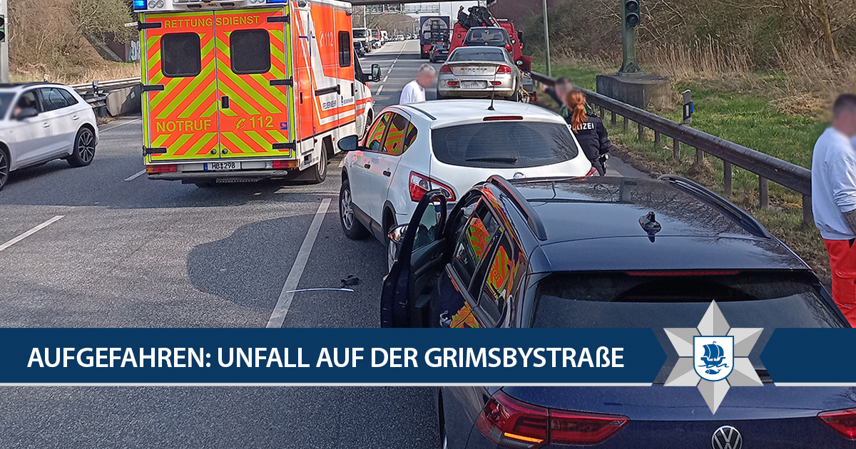 Gegen 14.10 Uhr befuhr ein 49-Jähriger in einem Lkw die Grimsbystraße in östlicher Richtung. Offenbar bemerkte der Lkw-Fahrer in Höhe der Feuerwehr zu spät, dass die Autos vor ihm verkehrsbedingt abbremsten. Er versuchte noch nach rechts auszuweichen, touchierte dabei jedoch einen vor ihm fahrenden Passat. Ein 37-Jähriger konnte seinen Nissan ebenfalls nicht mehr rechtzeitig stoppen und fuhr auf den vor ihm fahrenden Lkw auf. Der unmittelbar hinter dem Nissan fahrende 54-jährige Mann in einem VW-Golf erkannte die Situation ebenfalls zu spät und fuhr in die bereits verunfallten Fahrzeuge hinein. Durch die Wucht des Aufpralls lösten die Airbags des Golfs aus. Alle Beteiligten blieben glücklicherweise unverletzt.