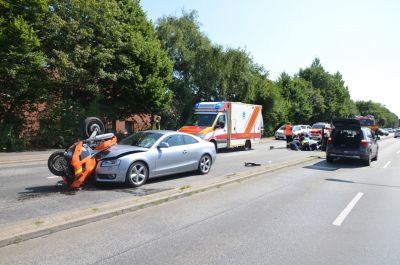 Ein 62 Jahre alter Motorradfahrer ist am Mittwochnachmittag bei einem Verkehrsunfall auf der Stresemannstraße schwer verletzt worden. Er kam von seiner Fahrbahn ab, geriet in den Gegenverkehr und stieß dort mit einem Pkw zusammen.